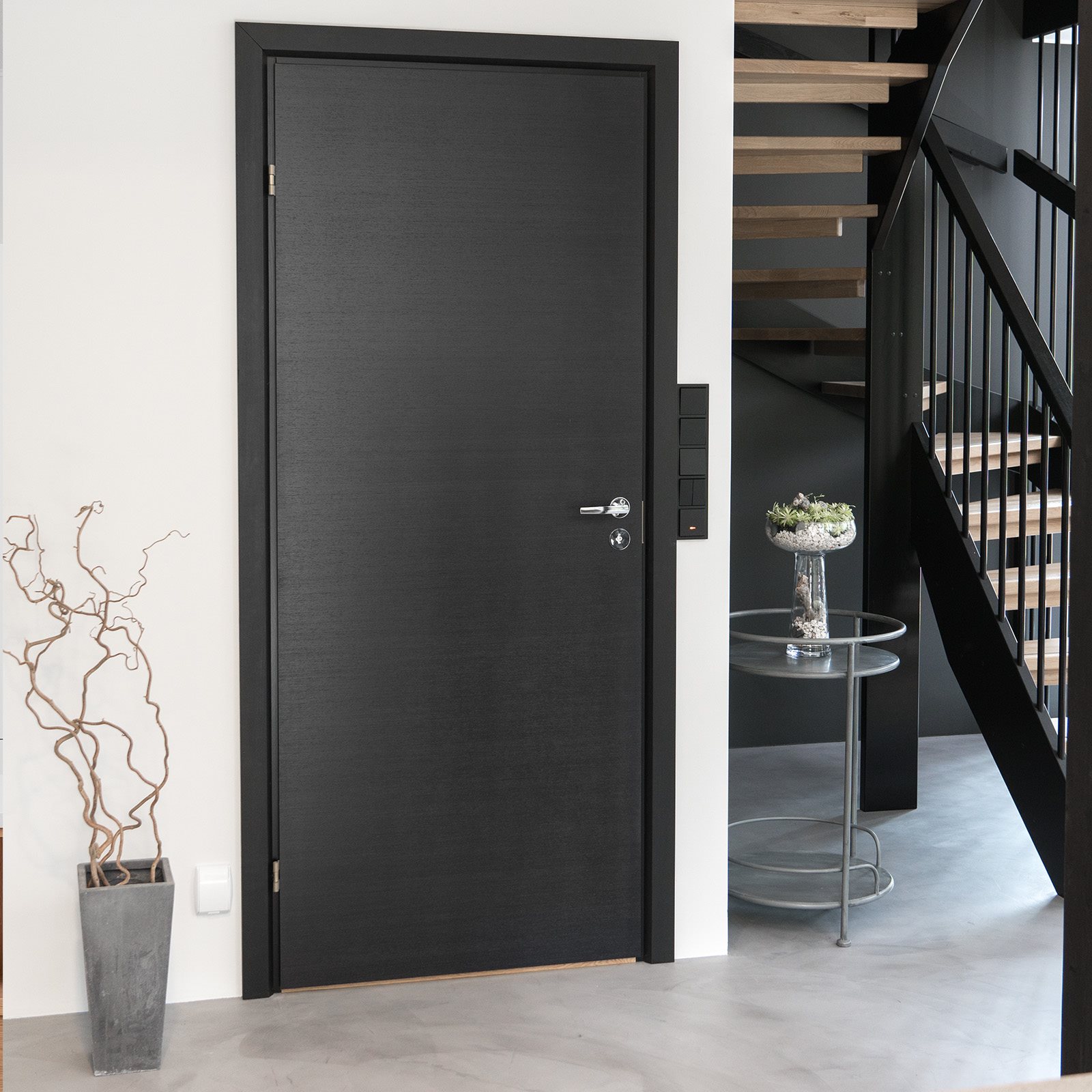 Sisäovisettiin kuuluu viilutettu tiivistetty karmi oven sävyyn. Mustaan oveen on saatavana tiivistetty ja oksaton musta karmi (NCS S 9000-N), ja pähkinäviilun yhteydessä suositellaan karmisävyä NCS S 7020-Y30R, joka viimeistelee kokonaisuuden harmonisesti. Laadukas karmirakenne parantaa oven ääneneristystä ja varmistaa pehmeän, hiljaisen sulkeutumisen.